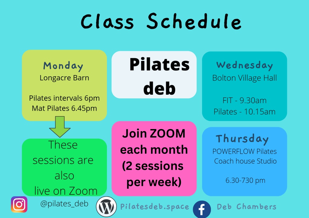 | Wed Book here for live classes https://bookwhen.com/debbiechambers | FIT new!!! Pilates | 9.30 – 10 am 10.15 – 11am | Bolton village Hall |